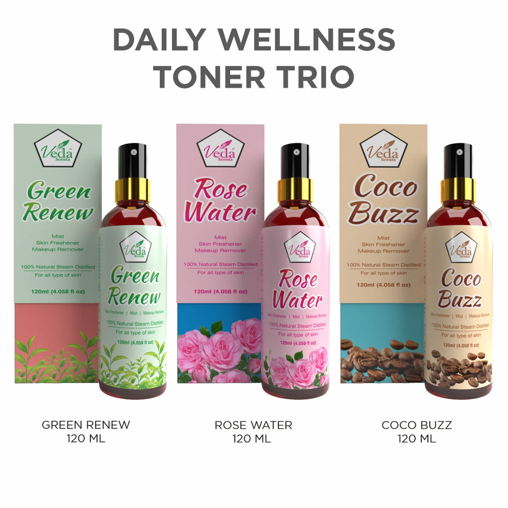 Refresh and rejuvenate your skin every day with the Daily Wellness Toner Trio β¨. This trio includes Coco Buzz (120 ml) π₯₯, Green Renew (120 ml) π and Rose Water (120 ml) πΉ, three nourishing toners des...